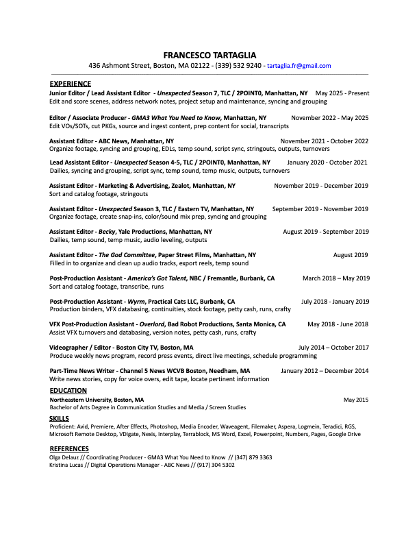 With over a decade of experience in the TV and Film Industry, I have worked roles ranging from newswriter to editor, with a strong focus on post-production. I’ve worked a wide range of projects for major networks like ABC, NBC, and TLC, handling everything from organizing footage and syncing sound to editing full segments and prepping content for digital and social platforms. My background includes both creative and technical proficiency across reality TV, scripted features, news, and marketing content. I am extremely proficient with Avid Media Composer and knowledgable in Adobe Creative Suite (Premiere, After Effects, Photoshop) and bring adaptability, attention to detail, and professionalism to every project.